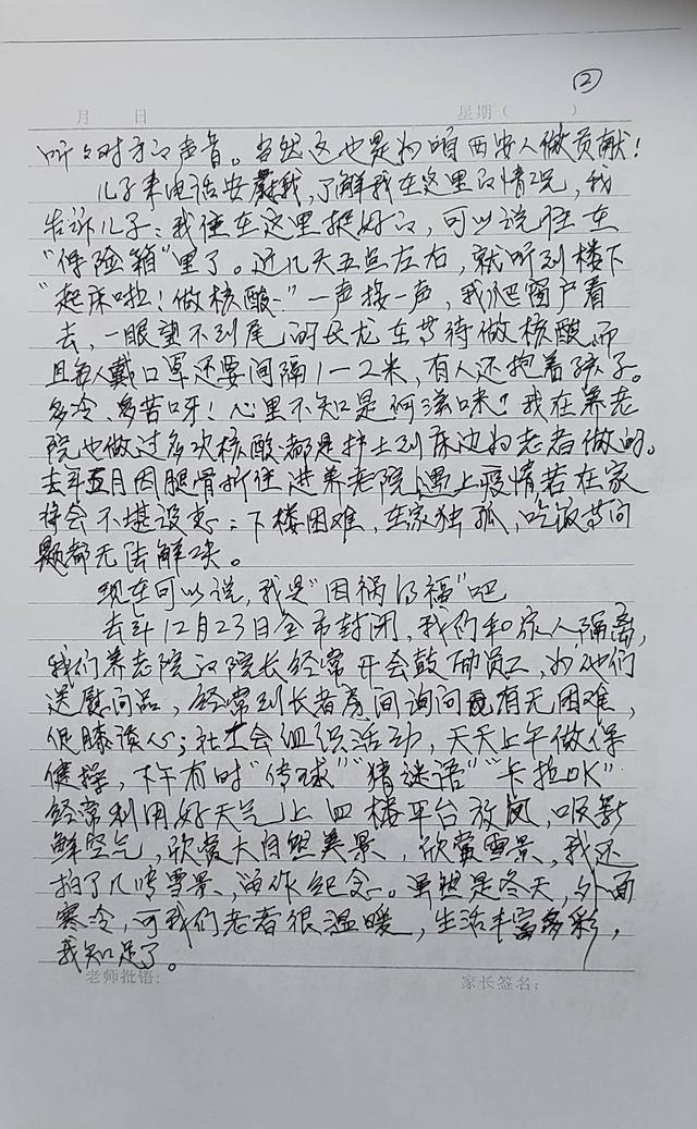 纸短情长,以上内容只是任奶奶亲笔信的一小部分,她用真挚质朴的语言记录了在养老中心生活的点滴,表达了居住感受,也从侧面反映了西安高新区在疫情防控期间,为老人提供的强有力生活保障。
