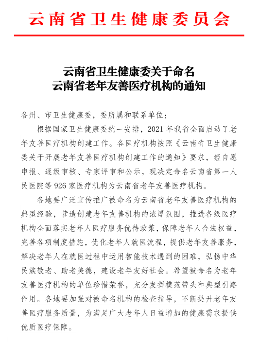 据悉,据《云南省卫生健康委关于开展老年友善医疗机构创建工作的通知》有关要求,普洱市中心医院(思茅区人民医院)于2021年全面启动了老年友善医疗机构创建工作。近日,经云南省卫生健康委评审复核,全省共有926家医疗机构达到创建标准,成为首批云南省老年友善医疗机构,普洱市中心医院(思茅区人民医院)位列其中。