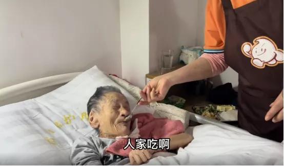 一位老人,护工给她塞的饭,都能积极主动地咽下去。
