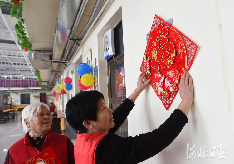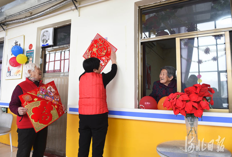 2022年1月25日是农历小年,河北省邢台市南和区益康老年公寓组织老人们开展贴福字、贴窗花、挂灯笼等传统民俗活动,喜迎新春佳节。河北日报记者赵永辉摄影报道