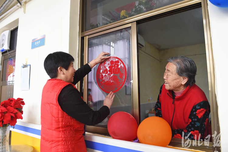 2022年1月25日,在河北省邢台市南和区益康老年公寓,护工和老人一起贴窗花迎新年。河北日报记者赵永辉摄影报道