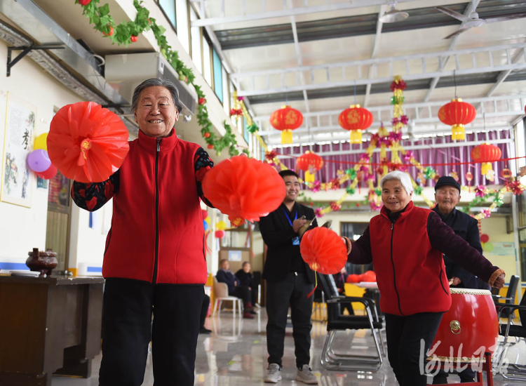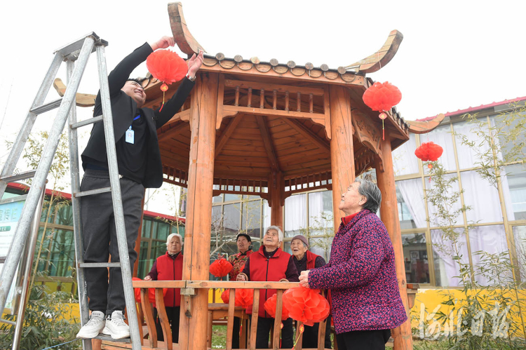 2022年1月25日,在河北省邢台市南和区益康老年公寓,工作人员和老人一起挂灯笼迎新年。河北日报记者赵永辉摄影报道