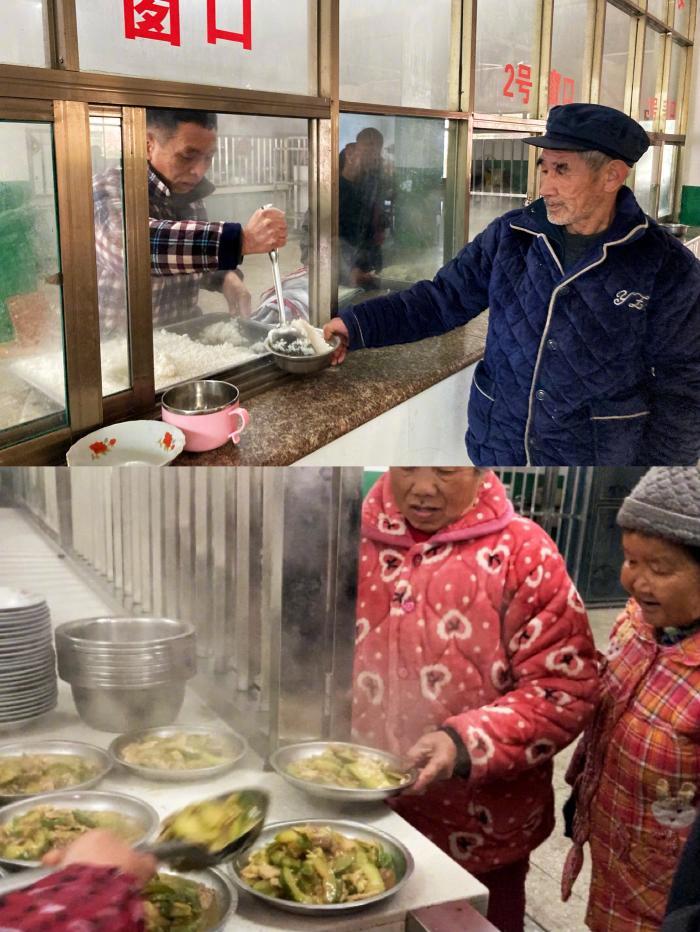 (⬆️院长及工作人员正在帮老人盛饭菜;本报记者摄)