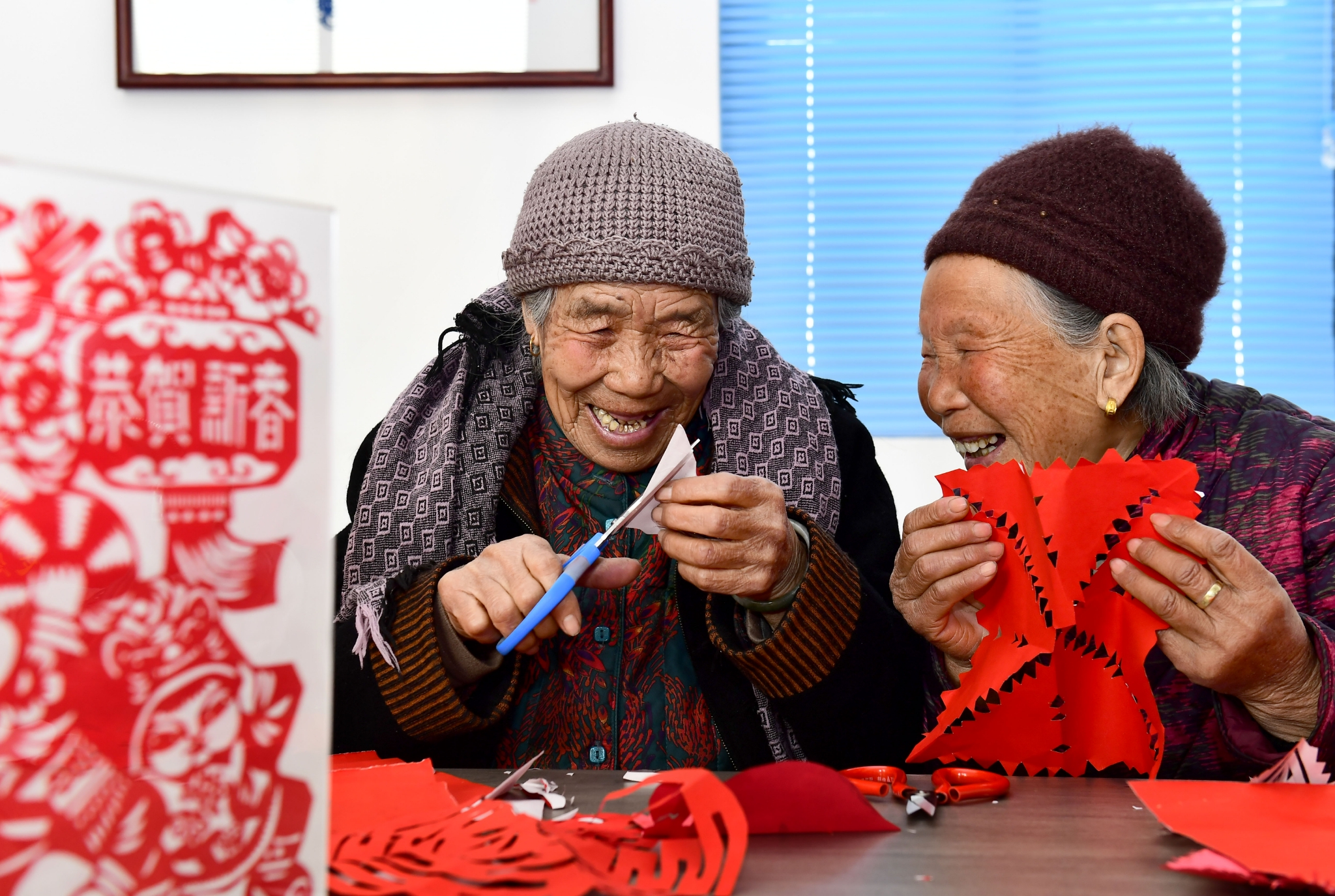 2月27日,在日照市岚山区虎山镇黄家峪村养老服务中心,两位老人边剪纸边聊天。新华社记者 郭绪雷 摄