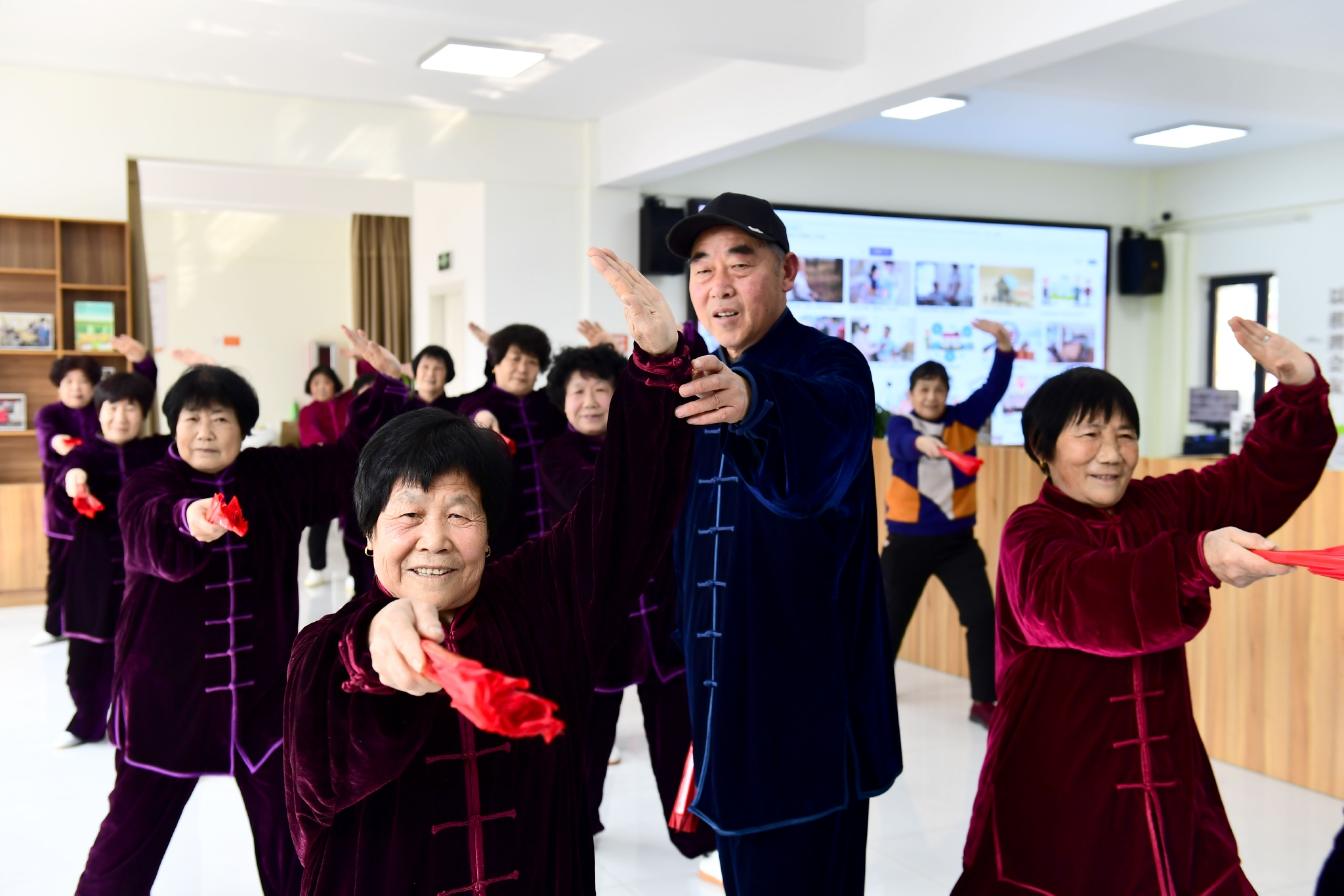 2月27日,在日照市岚山区安东卫街道凤凰山社区养老服务中心,老人们练习太极扇。新华社记者 郭绪雷 摄