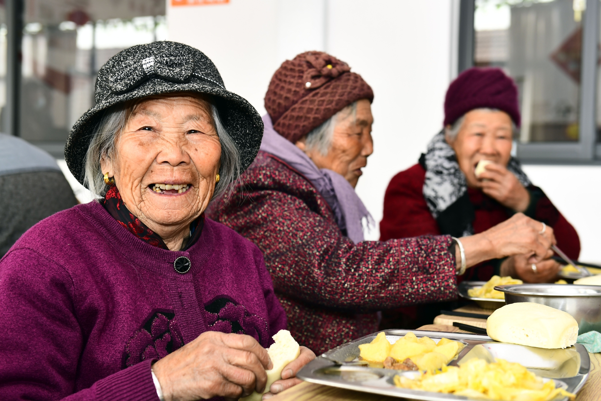 2月27日,在日照市岚山区虎山镇黄家峪村养老服务中心,老人在吃午餐。新华社记者 郭绪雷 摄