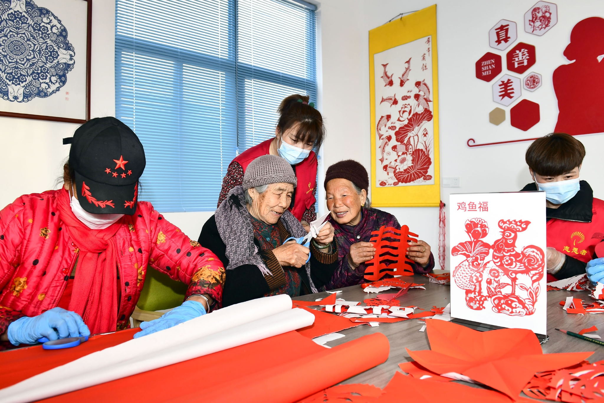 2月27日,在日照市岚山区虎山镇黄家峪村养老服务中心,“红辉暖心”志愿服务队队员陪老人剪纸、聊天。新华社记者 郭绪雷 摄