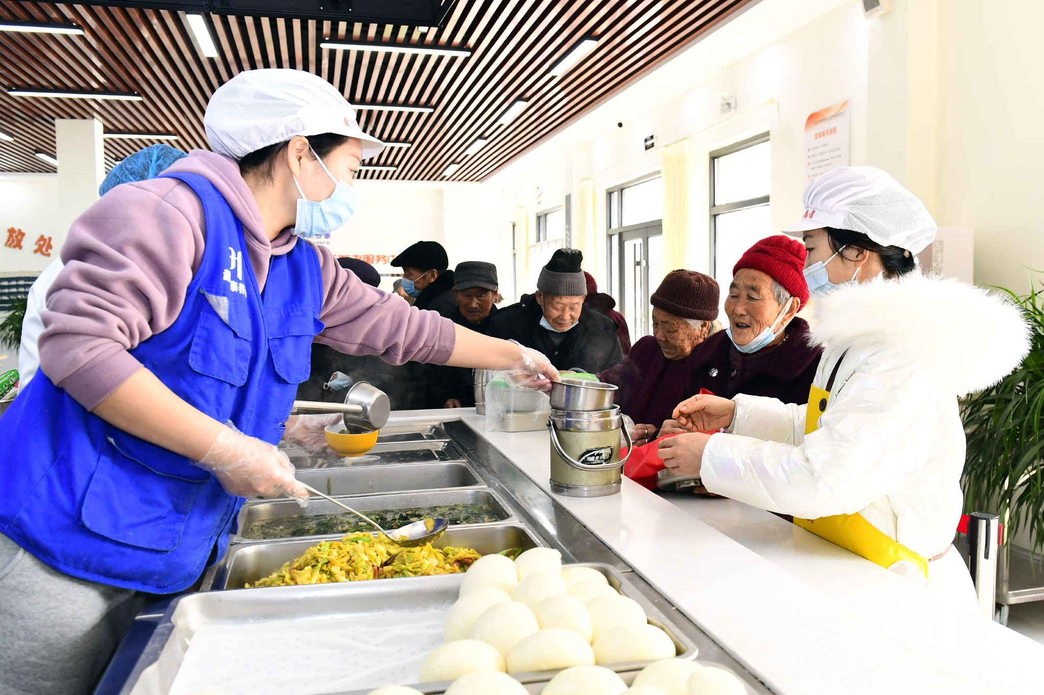 2月27日,在日照市岚山区安东卫街道凤凰山社区养老服务中心,工作人员为老人盛午餐。新华社记者 郭绪雷 摄